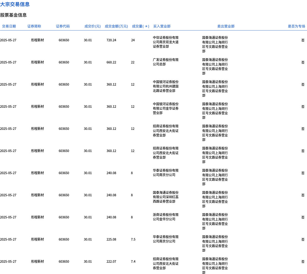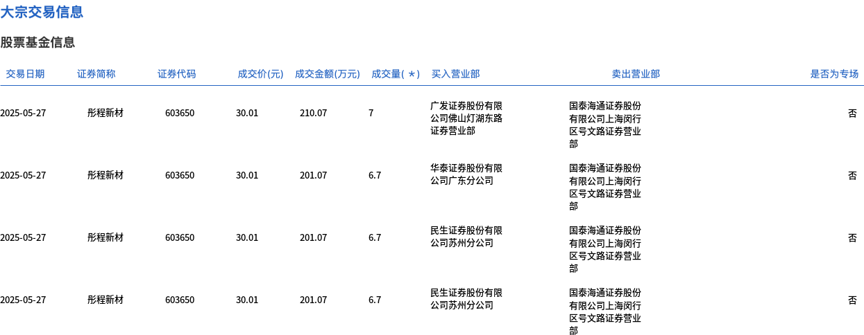 5月27日,彤程新材大宗交易成交160万股,成交额4801.61万元,占当日总成交额的19.82%,成交价30.01元,较市场收盘价32.47元折价7.58%。