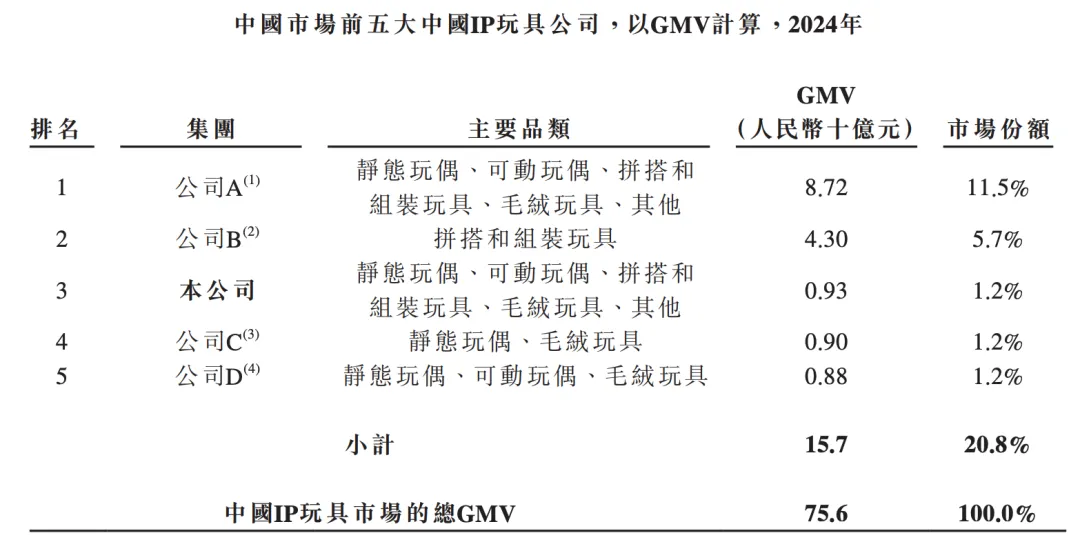 根据乐自天成招股书援引灼识咨询的数据,按2024年的GMV计算,52TOYS是中国第三大IP玩具公司。不过,这个头衔的含金量并不算高,因为对应到具体数值上,排在前两位的公司,大概率是已经上市的泡泡玛特和布鲁可,而排名在第三至第五位的公司,其年度GMV相差不足0.1亿元,且相应的市场份额都为1.2%。