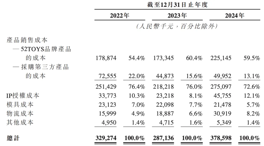 而较低的毛利率,取决于公司的商业收入结构。一方面,52TOYS的主要收入来自于授权IP,招股书数据显示,2022年至2024年,公司来自授权IP的收入占比分别为50.2%、59.3%和64.5%,逐年递增。其中,仅蜡笔小新相关产品在2022年至2024年的累计GMV就超过6亿元,占三年总收入的近40%。而授权IP需要公司支付相应的IP授权成本,报告期内,52TOYS的IP授权费用累计达1.03亿元。
