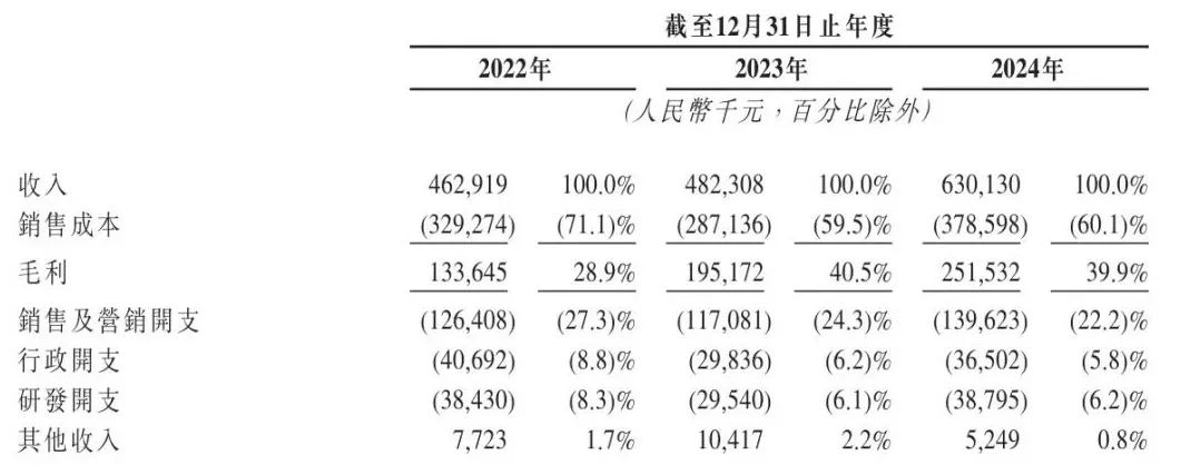 出现这样的情况,一个重要原因在于,52TOYS的毛利率在同类公司中一直较低。根据招股书数据,2022年至2024年,52TOYS的毛利率分别为28.9%、40.5%和39.9%,虽然出现了一定程度的增长,但与同赛道的其他公司相比,仍然差距较大。比如在2024年,泡泡玛特和布鲁可的毛利率分别为66.8%和52.6%。