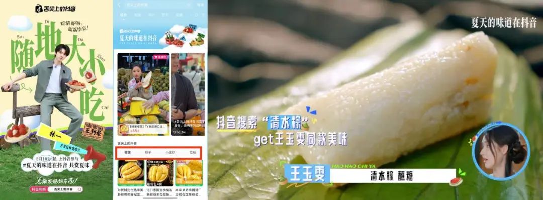 《舌尖上的抖音》是抖音电商针对春夏秋冬不同季节美食发起的系列活动,在今年3月和5月分别推出了主打春季限定美食的《第一口春味》,以及夏日美食的《夏天的味道在抖音》两档微综艺。节目每期15分钟左右的时长,邀请到郑恺、董宇辉、林一、王玉雯等艺人参与游戏互动。在节目中通过花字强调“搜索明星同款”或在抖音搜索节目名称的方式,即可通过抖音商城货架、直播、短视频等渠道进行选购,进而实现从微综艺内容影响力到带货变现的顺畅通路。