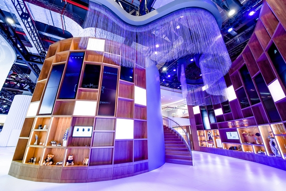 而今天,正在举办的2017年上海车展上,雷克萨斯的展台也发生了一些变化:舞台、标牌中一板一眼的横直线条被更多富有设计感的曲线取代;高冷的氛围灯换成了更为明亮和暖色的光线;原本空无一物的顶部空间也加入了颇具神秘色彩的流苏圆顶进行装点。