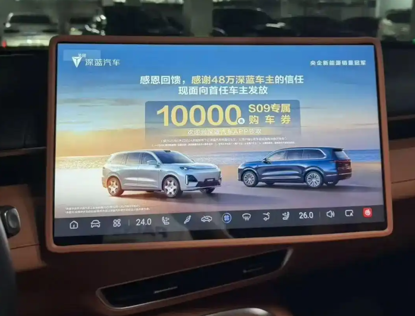 此前,有大量深蓝汽车车主在社交媒体上反映,深蓝汽车强制在车内屏幕上投放广告。广告内容为:“感恩48万深蓝车主信任,现面向首任车主发放10000万元S09购车券。”