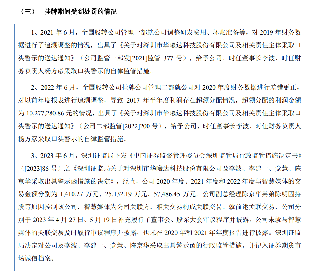 对此,2023 年 6 月,深圳证监局下发关于对深圳市华曦达科技股份有限公司及李波、李建一、党慧、陈京华采取出具警示函措施的决定,并记入证券期货市场诚信档案。