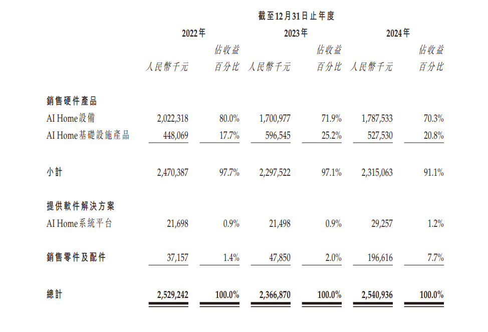 其中,2022年、2023年及2024年,来自AI Home设备收入分别为20.22亿元、17.01亿元及17.88亿元,占总营收比例分别为80%、71.9%及70.3%;来自AI Home基础设施产品的收入分别为4.48亿元、5.97亿元及5.28亿元,占总营收的比例分别为17.7%、25.2%及20.8%。