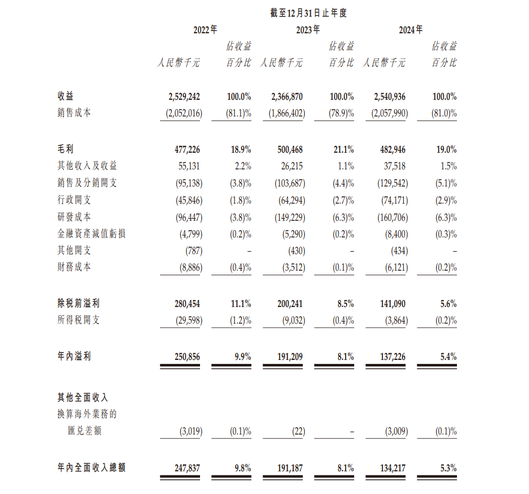 业绩方面,招股书显示,2022年、2023年及2024年,华曦达营收分别为25.29亿元、23.67亿元及25.41亿元;毛利分别为4.77亿元、5亿元及4.83亿元;年内溢利分别为2.51亿元、1.91亿元及1.37亿元。