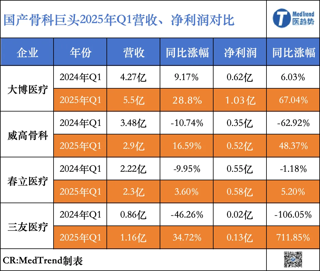 近期,国内骨科企业陆续公布2025年第一季度财报,国产龙头代表威高骨科、春立医疗、大博医疗、三友医疗均实现利润增长: