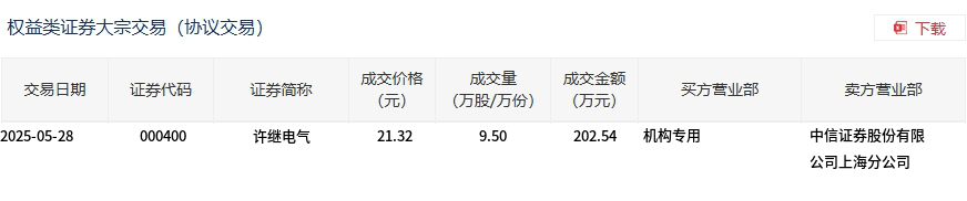 许继电气今日大宗交易平价成交9.5万股,成交额202.54万元