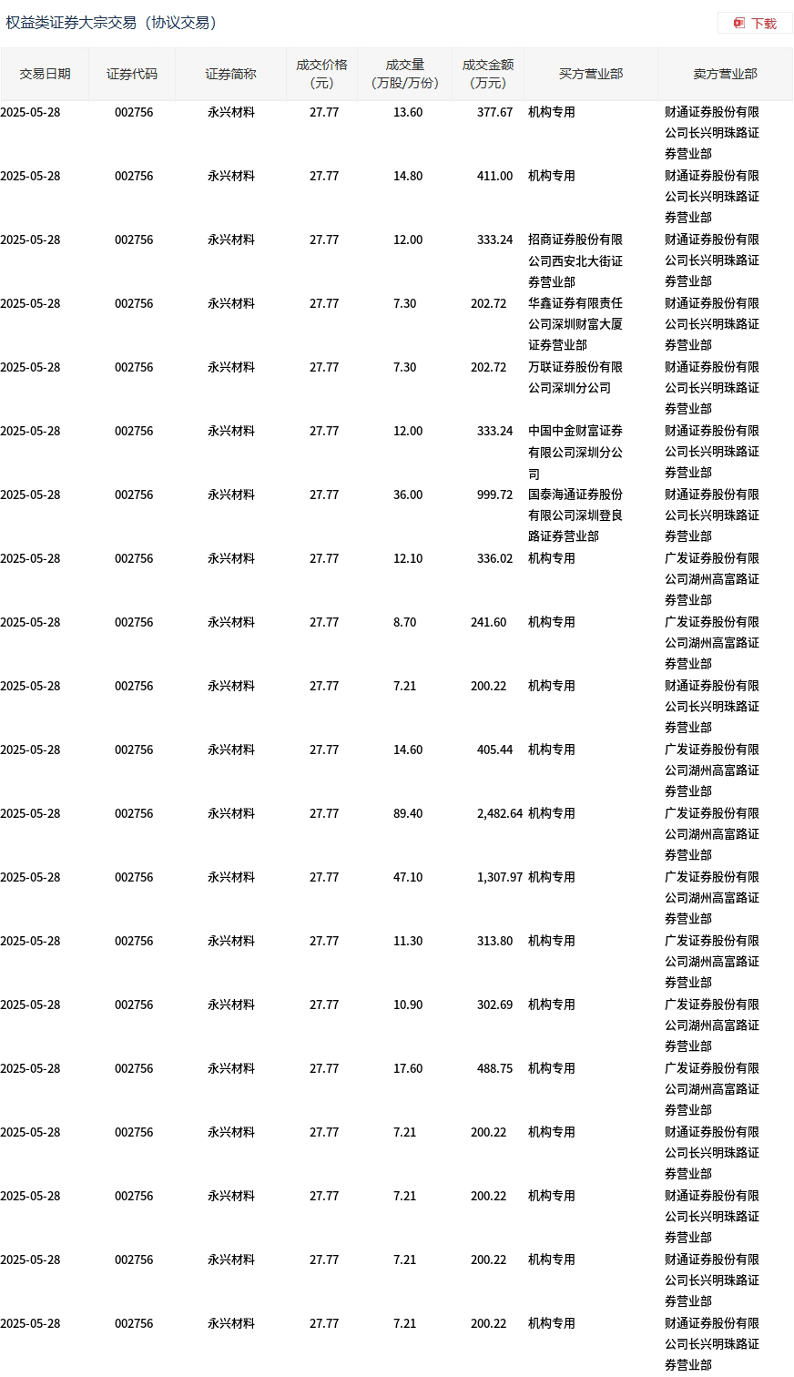 5月28日,永兴材料大宗交易成交704.67万股,成交额1.96亿元,占当日总成交额的62.66%,成交均价27.77元,较市场收盘价30.42元折价8.71%,其中最高成交价27.78元,最低成交价27.77元。