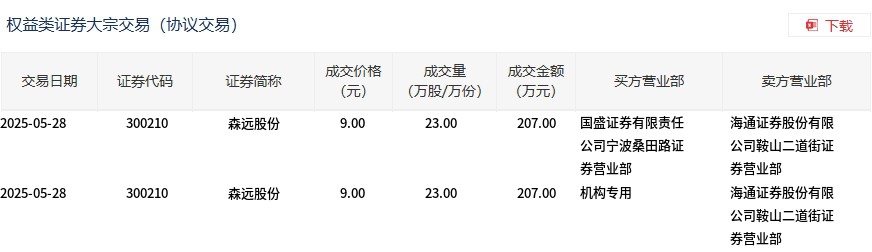5月28日,森远股份大宗交易成交46万股,成交额414万元,占当日总成交额的1.95%,成交价9元,较市场收盘价10.32元折价12.79%。