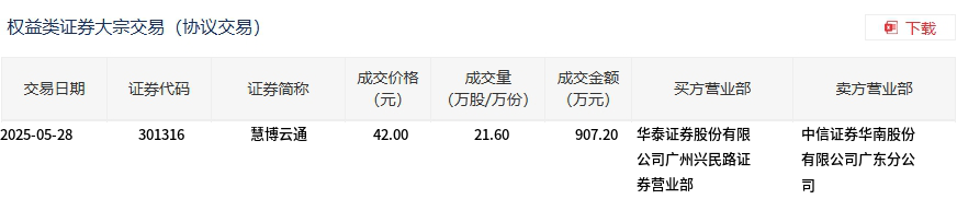 5月28日,慧博云通大宗交易成交21.6万股,成交额907.2万元,占当日总成交额的0.34%,成交价42元,较市场收盘价45.07元折价6.81%。