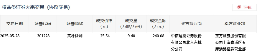 实朴检测今日大宗交易折价成交9.4万股,成交额240.08万元