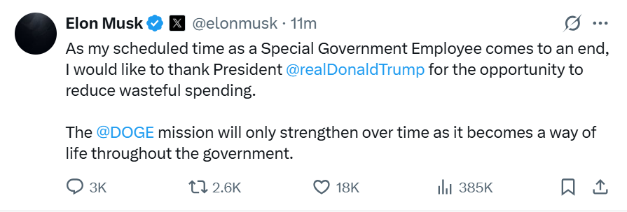 当地时间5月28日,美国政府效率部负责人埃隆·马斯克在社交媒体X上发文表示,在他作为特别政府雇员的任期即将结束之际,他想感谢美国总统特朗普给予的减少政府浪费性支出的机会。马斯克表示,政府效率部的使命只会随着时间的推移而加强。