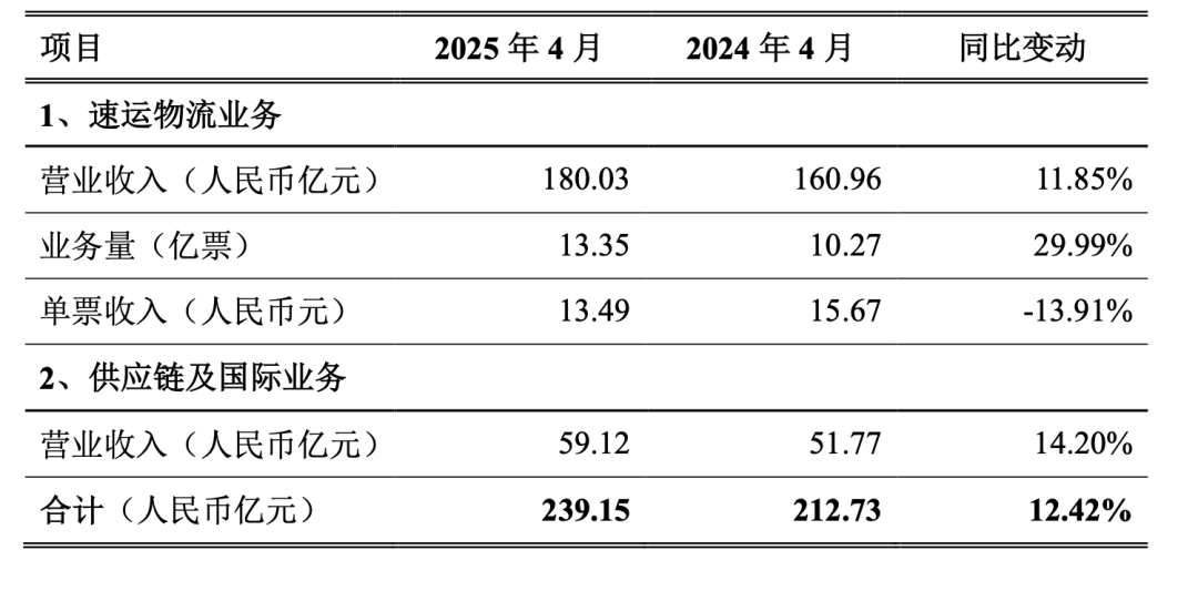 前不久,顺丰公布了2025年4月运营情况,速运物流业务、供应链及国际业务合计收入为239.15亿元,同比增长12.42%。分业务看,速运物流业务收入同比增长11.85%,业务量同比增长29.99%;供应链及国际业务收入同比增长14.20%。
