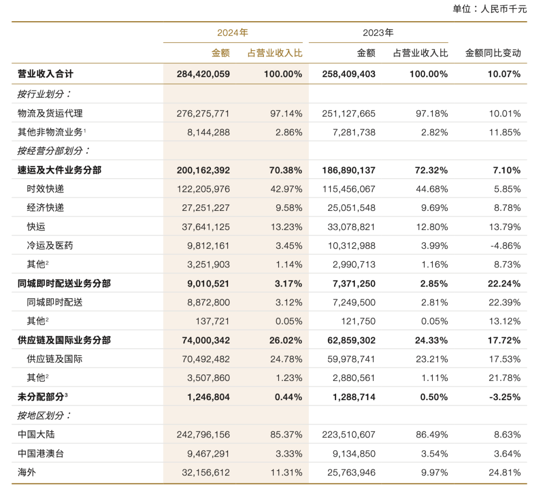 但是,当前,作为营收和利润支柱,顺丰速运及大件分部2024年的增速仅为7.1%,其中占大头的时效快递增速也只有5.85%,经济快递的增长也是个位数。
