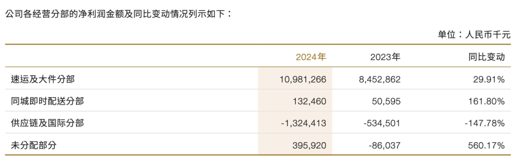 同时,顺丰即时配送分部虽然在2024年净利润大幅度提升,但仅有1.32亿元,占比偏小,还未形成主要盈利的贡献点。