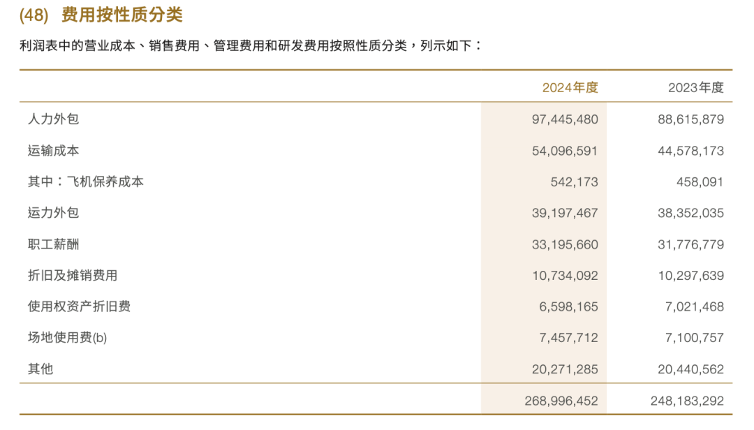 顺丰在财报中称,公司将其中的外包成本主要拆分为人工和运力两类,并分别与职工薪酬、运输成本合并统计为人工成本和运力成本。