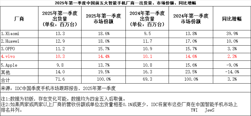 这意味着,在头部厂商比拼更加焦灼的势态下,市场份额里每1%的争夺都代价高昂。IDC数据显示,vivo国内市场排名已从2024年的榜首滑落至2025年Q1的第四位。