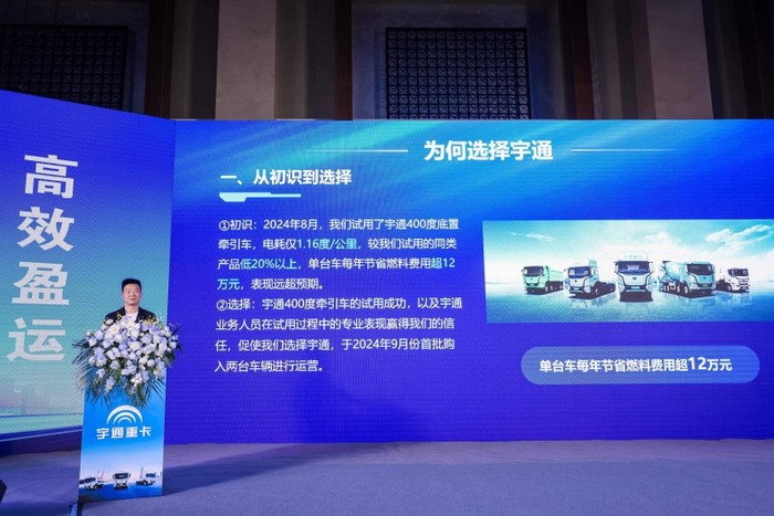 宇通的实际运营表现不负期望:以甬金线520公里的线路为例,使用宇通新能源牵引车,单趟能耗成本较燃油车,可节省60%左右,也就是400元以上。