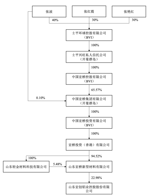 股权穿透显示,宏创控股与宏拓实业同属“魏桥系”控制。宏创控股控股股东山东宏桥新型材料有限公司(下称宏桥新型材料)与宏拓实业控股股东魏桥铝电,均为张波家族实际控制企业。本次交易本质上是将港股中国宏桥(01378.HK)的核心资产转移至A股平台。
