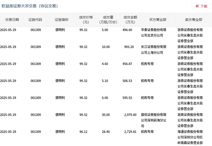5月29日,德明利大宗交易成交89.1万股,成交额8758.53万元,占当日总成交额的19.44%,成交均价98.3元,较市场收盘价109.7元折价10.39%,其中最高成交价99.32元,最低成交价96.12元。