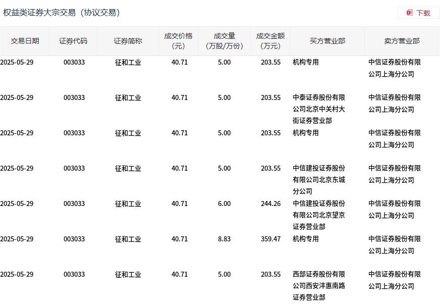 5月29日,征和工业大宗交易成交39.83万股,成交额1621.48万元,占当日总成交额的15.08%,成交价40.71元,较市场收盘价45.53元折价10.59%。