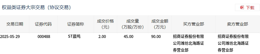 ST晨鸣今日大宗交易平价成交45万股,成交额90万元