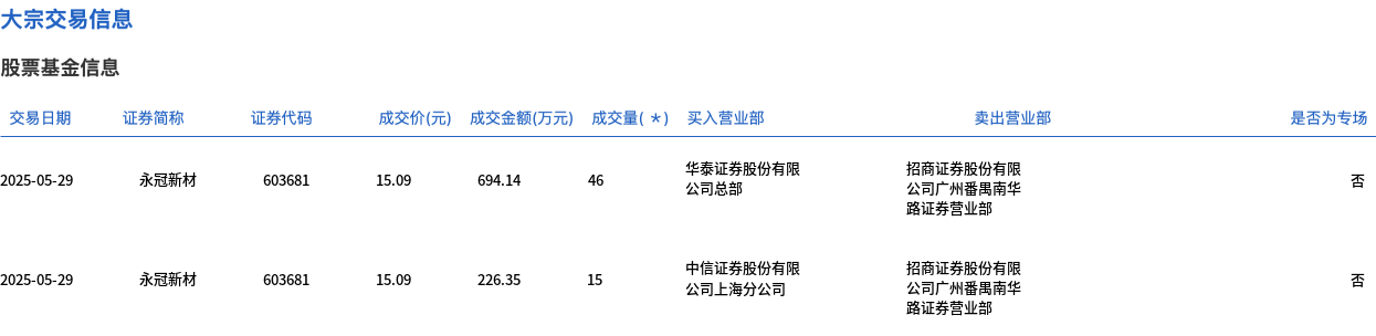 5月29日,永冠新材大宗交易成交61万股,成交额920.49万元,占当日总成交额的1.28%,成交价15.09元,较市场收盘价18.45元折价18.21%。