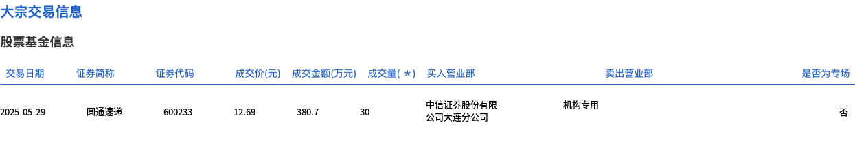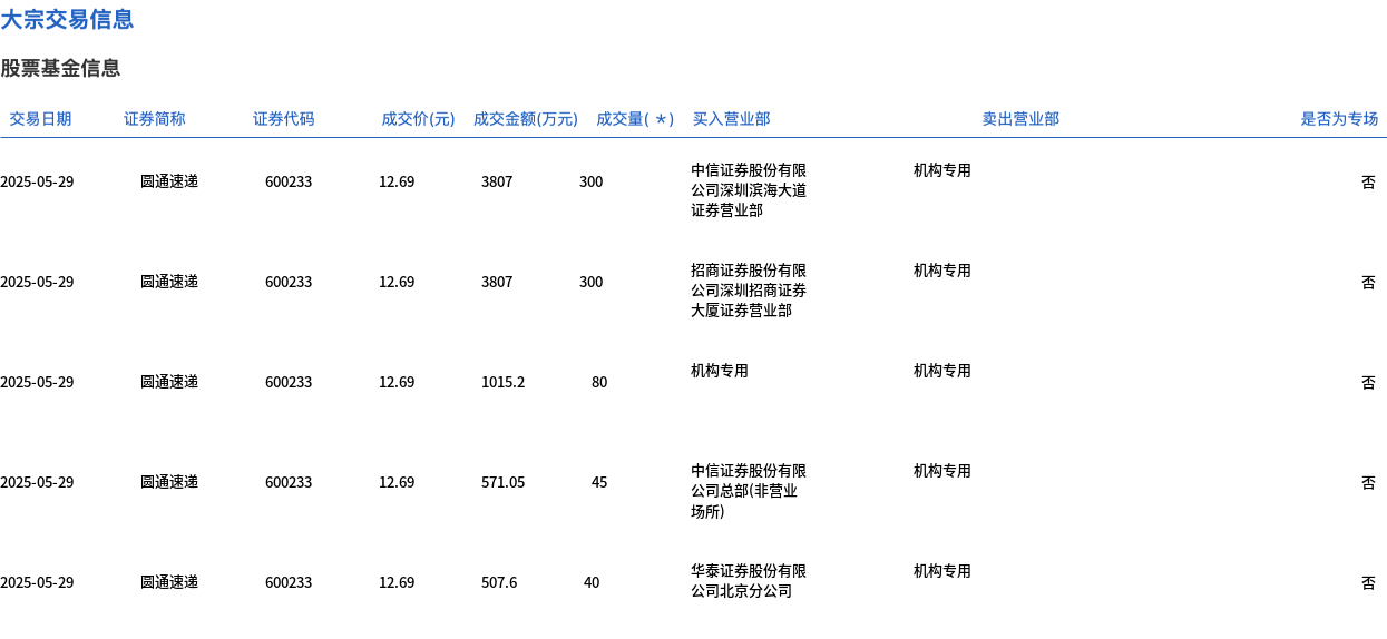 5月29日,圆通速递大宗交易成交795万股,成交额1.01亿元,占当日总成交额的15.22%,成交价12.69元,较市场收盘价13.5元折价6%。