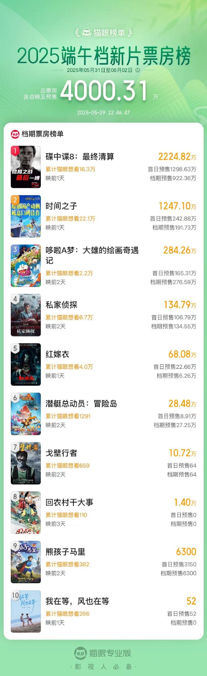 据猫眼专业版数据,截至5月29日22时46分,2025年端午档新片预售总票房(含点映)破4000万,《碟中谍8:最终清算》持续领跑。