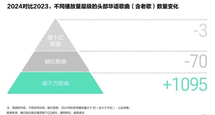 与此同时,得益于音乐分众化的趋势、供给端丰富的垂类音乐内容和平台精准的个性化推荐,更多类型歌曲获得市场关注,在2024年,破亿及破十亿的头部华语歌曲(含老歌)数量呈现减少态势,播放量破千万的歌曲则比2023年增长了1095首。