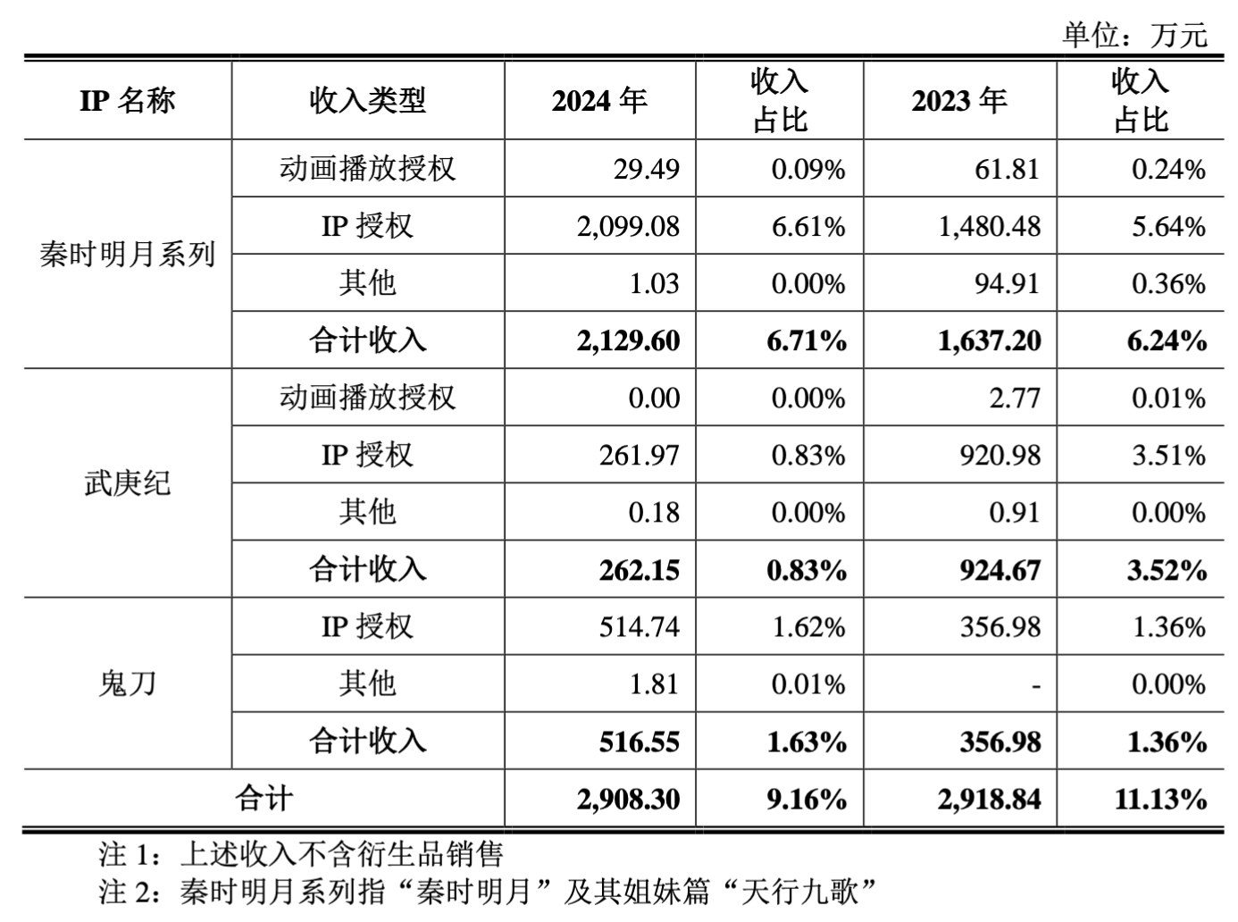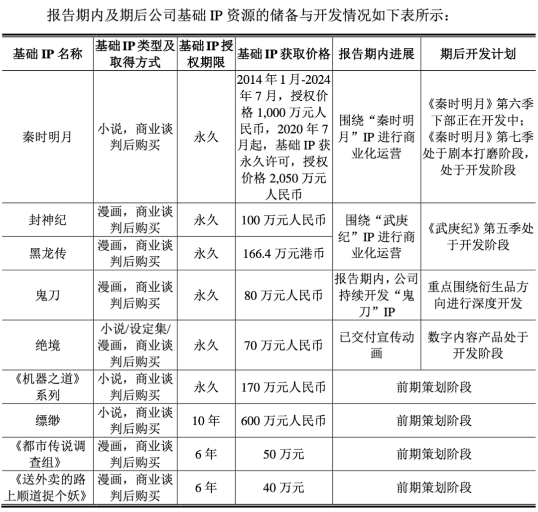 另外,从IP角度来看,根据审核问询函的回复,自有IP部分,其中《秦时明月》系列2023年和2024年分别贡献了1637.20万元和2129.60万元的营收,占比最高,其中IP授权收入最为可观,分别为1480.48万元和2099.08万元,占到总营收的5.64%和6.61%。