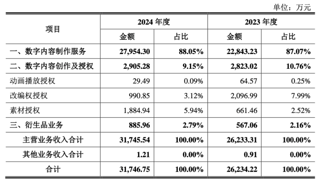 有关营收分布和具体占比,2023和2024年,玄机科技分别有87.07%和88.05%的收入来自“数字内容制作服务”,也就是动画制作,为公司的营收重心,两年分别取得2.28亿元和约2.8亿元收入,同比实现上升。