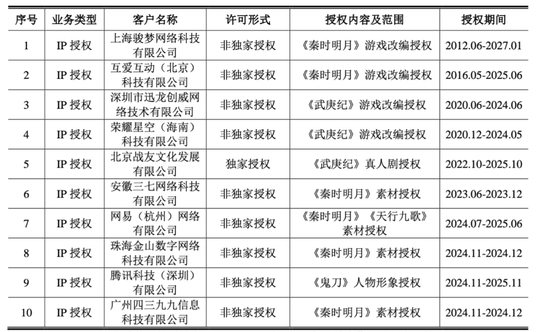 玄机科技的IP授权客户相对分散,2023年和2024年,动画播放授权及IP授权报告期内各期收入曾超过100万元的公司为10家。从中可见不少IP授权项目目前都已到期或即将到期,具体涉及游戏、真人剧等类别。