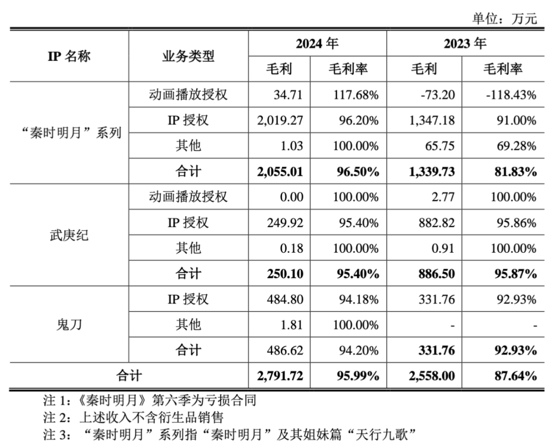 IP毛利率方面,“秦时明月”系列2023年和2024年的毛利率分别为81.83%和96.50%,对应1339.73万元和2055.01万元的毛利;《武庚纪》2023年和2024年的毛利率分别为95.87%和95.40%,分别对应886.50万元和250.10万元毛利;此外《鬼刀》的毛利率分别为92.93%和94.20%,毛利分别为331.76万元和486.62万元。