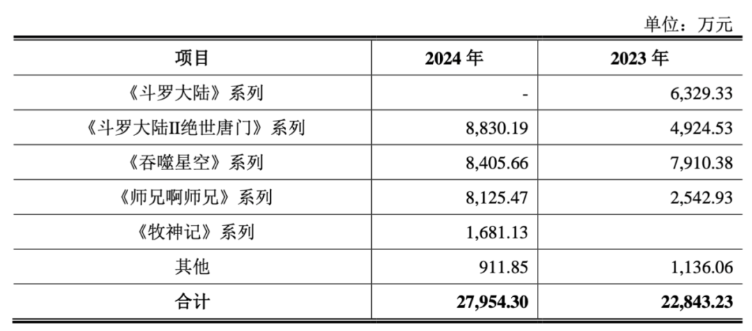 其中《斗罗大陆》系列2023年贡献了6329.33万元营收;《斗罗大陆‖绝世唐门》系列2023年和2024年分别贡献4924.53万元和8830.19万元收入,同比实现增长;《吞噬星空》系列2023年和2024年在这部分的收入分别为7910.38万元和8405.66万元,收入一直维持在高位;《师兄啊师兄》系列则分别带来2542.93万元和8125.47万元营收,2024年同比有较大幅度的增长;《牧神记》系列2024年在这部分的相关营收为1681.13万元。
