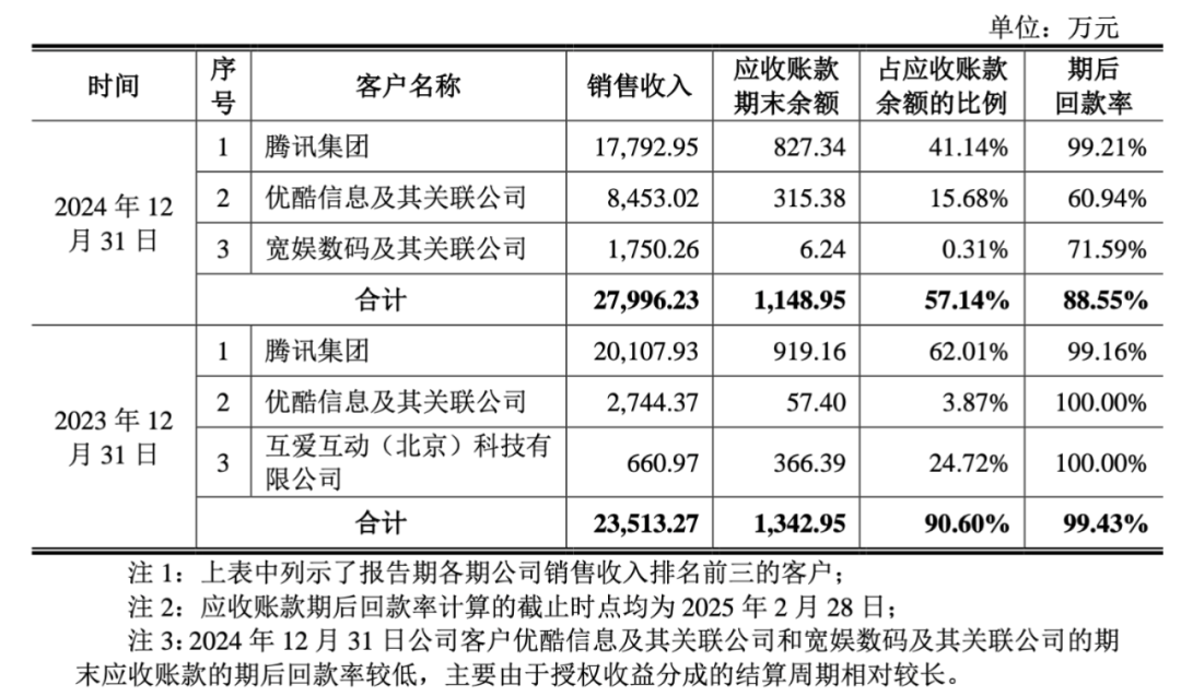 2024年来自腾讯、优酷、B站的销售收入分别为1.78亿元、8453.02万元和1750.26万元,应收账款期末余额分别为827.34万元、315.38万元和6.24万元。