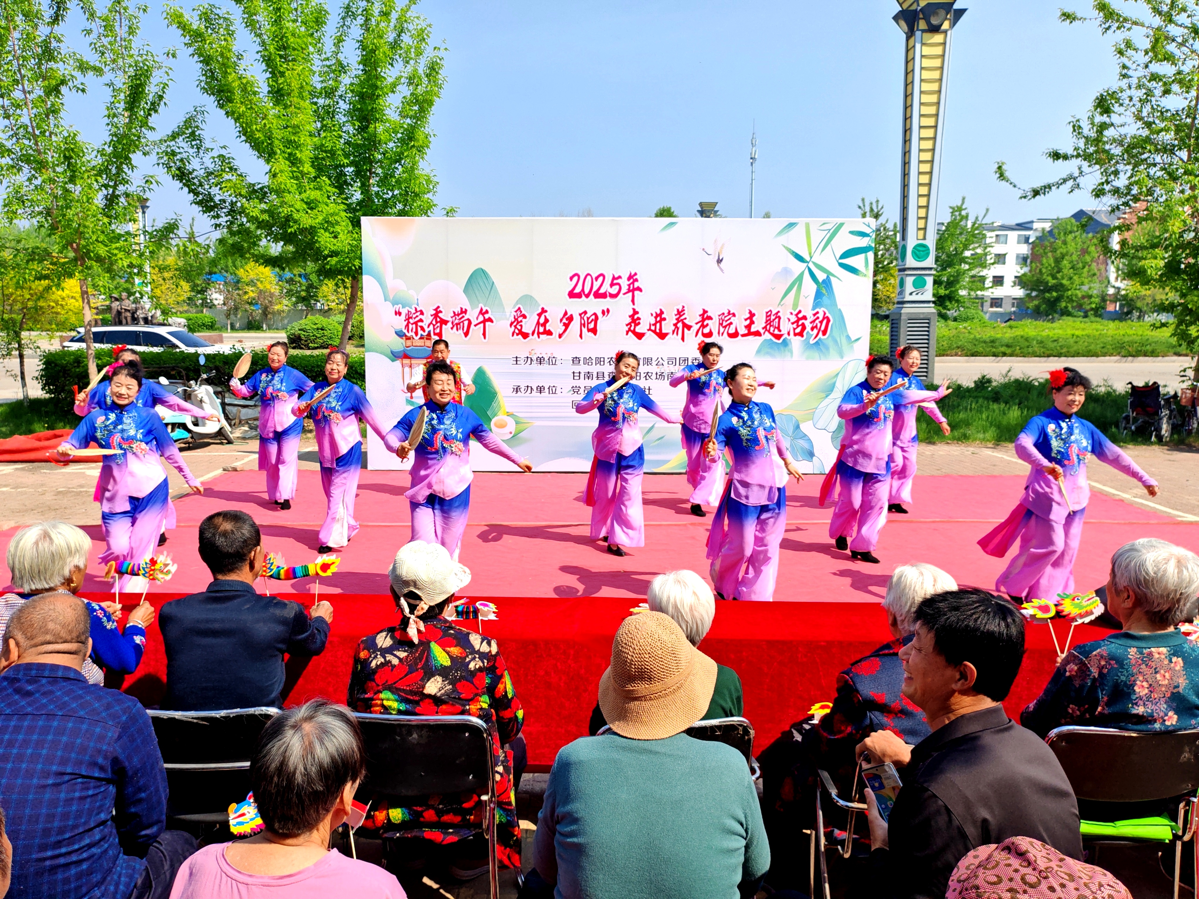 28日上午,北大荒集团查哈阳农场南福社区联合农场团委开展的“粽香端午 爱在夕阳”主题活动,在党员老友文艺社带来的优美舞蹈中拉开序幕。身着彩衣的退休文艺骨干们相继表演了经典红歌联唱、东北秧歌舞等10个节目,舞台下老人们跟着节奏轻轻哼唱、拍手应和。青年志愿者带来的诗歌朗诵《当你老了》以舒缓的语调引发全场共鸣。