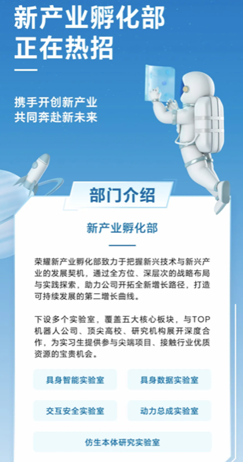 人才层面:荣耀招聘微信公众号于3月31日,为下设具身智能实验室、仿生本体研究实验室等多个实验室的荣耀新产业孵化部,招募2025年实习生,其中就包括机器人数据生成算法工程师、机器人虚拟仿真平台工程师、机器人动力系统(关节电机)仿真工程师等多个机器人相关岗位。