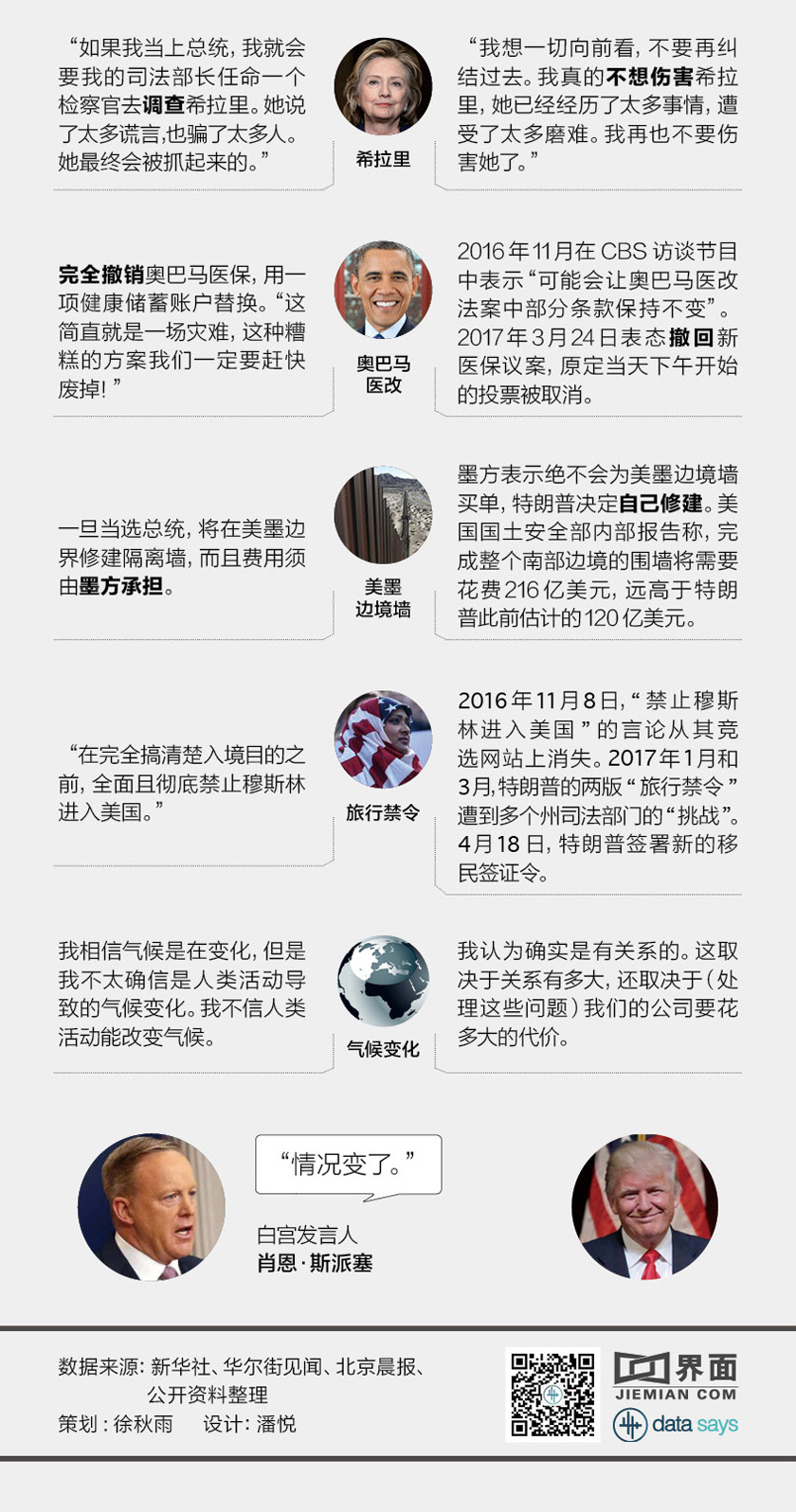 4月29日是美国第45任总统唐纳德·特朗普宣誓就职的第100天。界面新闻记者为您盘点,这位时常“语出惊人”的总统在当选后兑现了哪些承诺,又对哪些人和事发表了与当选前截然不同的观点。