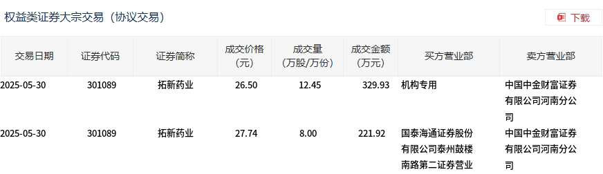 5月30日,拓新药业大宗交易成交20.45万股,成交额551.85万元,占当日总成交额的1.45%,成交均价26.99元,较市场收盘价32.64元折价17.32%,其中最高成交价27.74元,最低成交价26.5元。