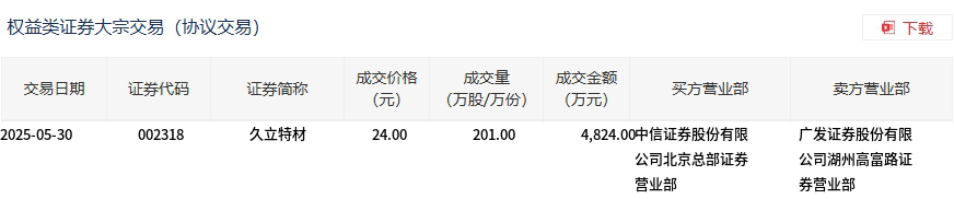 5月30日,久立特材大宗交易成交201万股,成交额4824万元,占当日总成交额的27.25%,成交价24元,较市场收盘价24.64元折价2.6%。