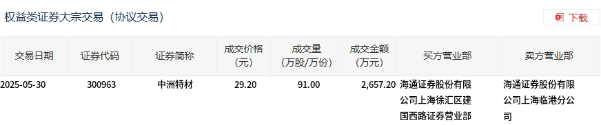 中洲特材今日大宗交易平价成交91万股,成交额2657.2万元