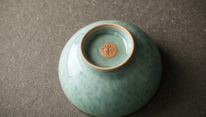 茶汤入盏,好似湖面中的天空倒影,浮云随波而动,甚是有趣。底款书“辉”字,乃龙泉青瓷制作名家吴美辉先生之手制作品。