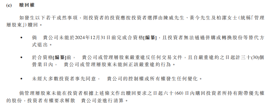值得注意的是,每一轮融资均附带优先权,优先权的主要条款包括清算优先权、反摊薄权、赎回权等。其中赎回权要求:若公司未能于2024年12月31日前完成合资格(编纂)(港股中的“编纂”一词通常用于标注待确认、待填写或待补充的内容 ),且投资者无法通过并购或转换股份等替代方式退出时,可以要求赎回。