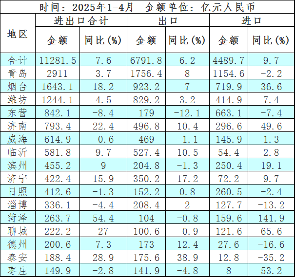2025年前4个月,山东进出口总值1.13万亿元,同比增长7.6%,增速领跑全国前五大外贸省市。其中,胶东五市作为山东开放前沿,以占全省超六成的进出口体量,撑起了全省的外贸基本盘。