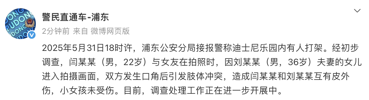 日前,上海迪士尼度假区内一对情侣和一对带孩子的夫妇发生纠纷的视频引发网友关注。6月1日晚,@警民直通车-浦东 微博通报,5月31日18时许,浦东公安分局接报警称迪士尼乐园内有人打架。经初步调查,闫某某(男,22岁)与女友在拍照时,因刘某某(男,36岁)夫妻的女儿进入拍摄画面,双方发生口角后引发肢体冲突,造成闫某某和刘某某互有皮外伤,小女孩未受伤。目前,调查处理工作正在进一步开展中。