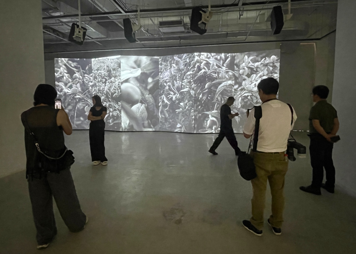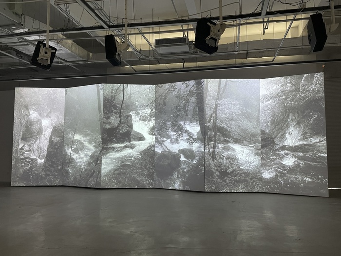 不管AI时代如何演变,中国美术学院教授、艺术家高世强用东方哲学来解读。他用影像作品《山水:终南》采用六折屏的中国传统屏风的形式。一方面是因为太平峪层层叠叠的瀑布给人一种行行复行行的深度体验,另一方面则是终南山“空谷幽兰”的隐逸意涵与“终南捷径”的传统说法,所形成文化方面的张力美感,更多是带来一种对人类未来的哲学思考。
