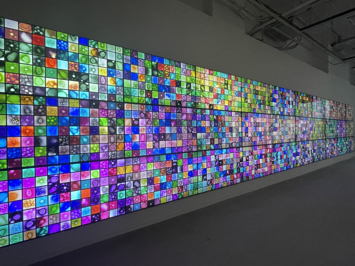 一整面墙的《世间》气势宏大,色彩跳跃,充满想象空间。几十米长的距离,由来自芸芸众生的微生物细胞构成,而且还在不断的演变迭代中。