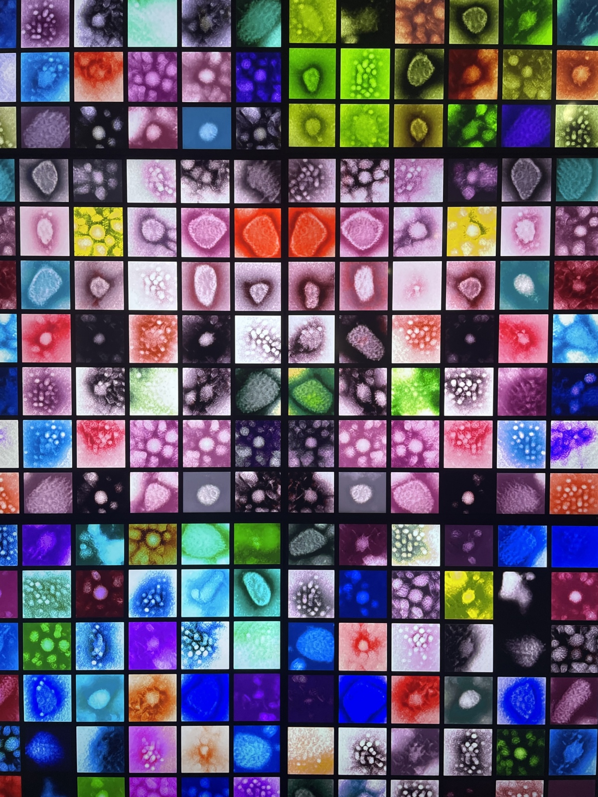 这组作品由同济大学教授、艺术家于幸泽和人工智能协作完成。据悉,作品源自10304张透射电子显微镜下的微生物图片数据集,经过StyleGAN2预训练模型的3600次迭代,4小时采样制作,呈现出作品“世间”的图像生成模型,生成丰富多彩的可视化像素格,并进行了15秒循环播放,展现出人工智能无限的想象力和创意能力,更表现出共生世界中人工智能、数据科学和技术、人类与微生物之间的相互关系。